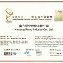 展會同期還舉行了2013泵閥行業-榮格技術創新獎的頒獎典禮,該活動由榮格工業傳媒及旗下《世界泵業—中國版》雜志聯袂中國環博會(IE expo)共同舉辦,共評選出19家對我國泵閥行業做出突出貢獻的19家國內外知名企業,涵蓋了五大類共19項創新產品。南方泵業的NSC單級雙吸中開式離心泵憑借突出的技術優勢被評選為“離心泵”類產品中的技術創新獎。